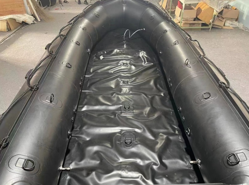 船體特點(diǎn):船體一圈有3個(gè)氣室,充氣是一體充氣裝置,可以同時(shí)把3個(gè)氣囊充起來,甲板為卷簾式甲板,可以隨船一體折疊卷起,底部有一個(gè)單獨(dú)充氣龍骨,單獨(dú)充氣,充氣后船底為V型。浮筒一體充氣和卷簾式甲板節(jié)約了船組裝的時(shí)間,用外接12v電動(dòng)充氣泵,充氣時(shí)間可以控制在90秒內(nèi)。大大提高了使用效率。